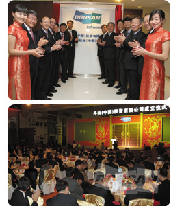 More than 250 people attended a ceremony in Beijing on November 7 to mark the establishment of Doosan Infracore China Investment Co. (DICI) In his address, President Choe Sung-chul revealed a "Ten-Ten" plan that calls for operating profit to reach 10% (W1 trillion) of W10 trillion in total annual sales in 2010. He said that this accomplishment would rank his company among the global Top 5. President Choe declared that DICI would be a lynchpin in the corporate globalization strategy. He added that the new holding company would enable Doosan Infracore to become the leader of the infrastructure support business in China, which will serve as a "second home market" for the company.