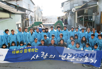 On the 26th, a group of 40, comprised of executives and staff members from Doosan Infracore’s Incheon factory along with their children, delivered 2000 coal briquettes to low-income families designated by the Incheon Coal Briquette Factory.