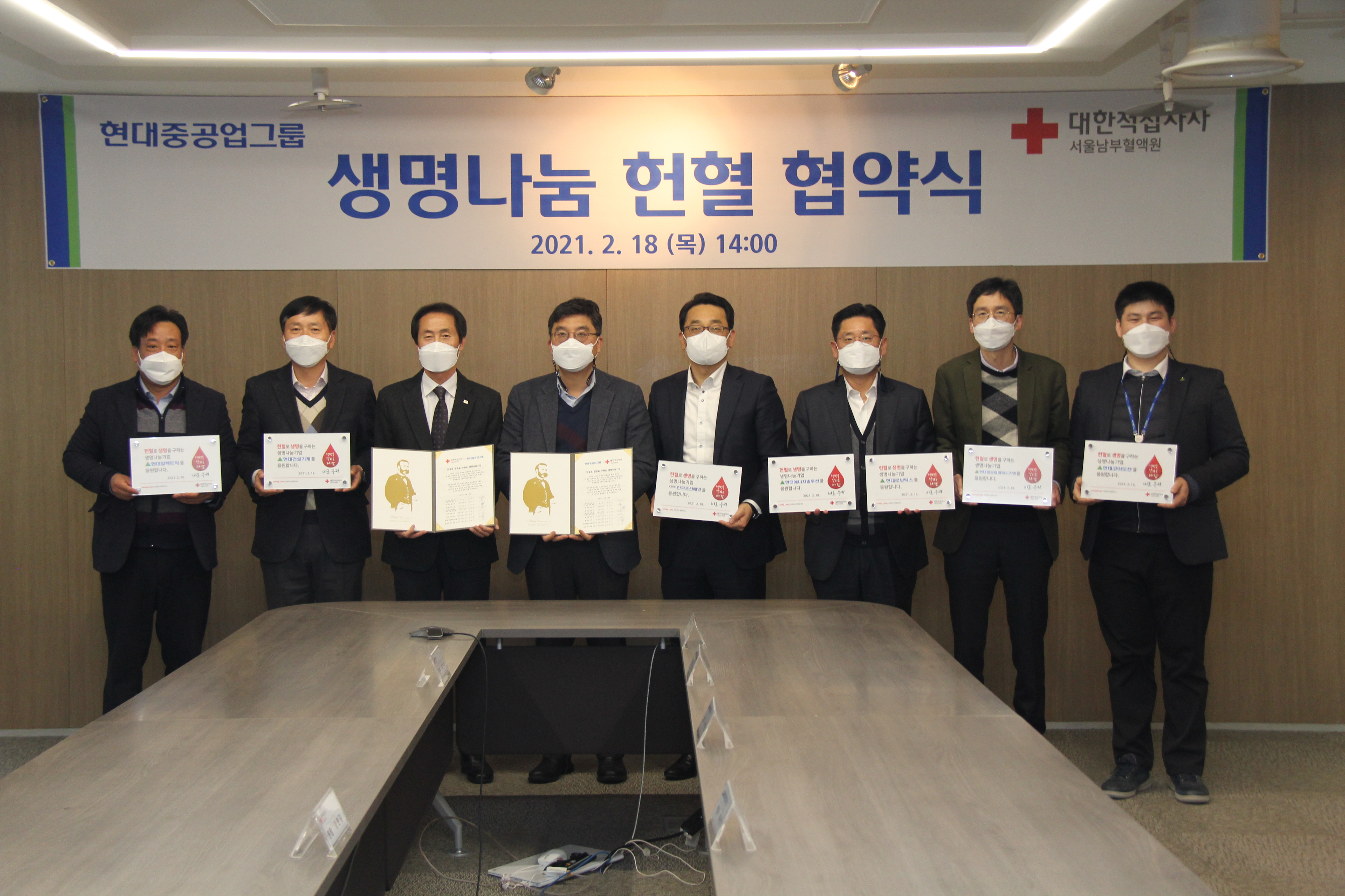 현대중공업그룹은 지난 18일 현대건설기계 등 분당 소재 7개 계열사가 참여한 가운데 대한적십자사 서울남부혈액원과 「생명나눔기업」 헌혈 협약식을 가졌다.