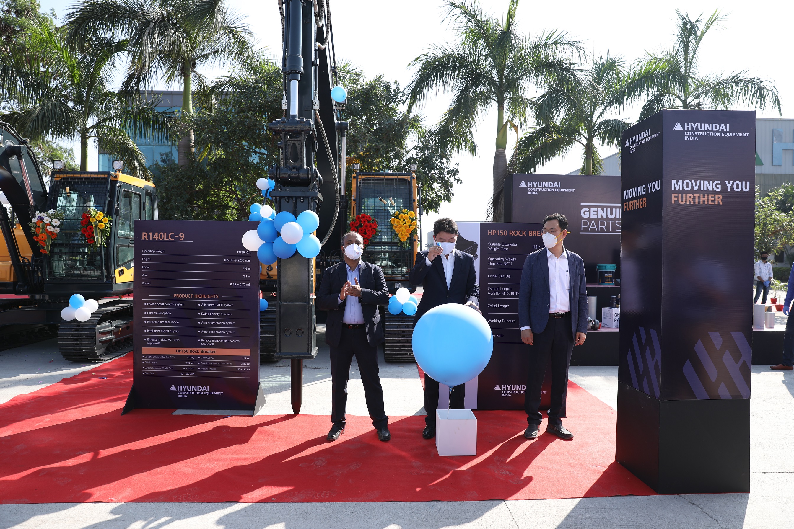 코로나 방역 수칙에 따라 푸네공장 앞 공간에서 준비된 이번 행사는 장비 전시와 함께 암반용 브레이커, 크랍쉘 버켓, 퀵 커플러 등 다양한 어태치먼트류와 순정부품도 도 전시해 주목을 받았습니다. 특히 출시된 제품의 키전달식과 출시 퍼레이드로 참관객들의 큰 박수를 받았습니다.