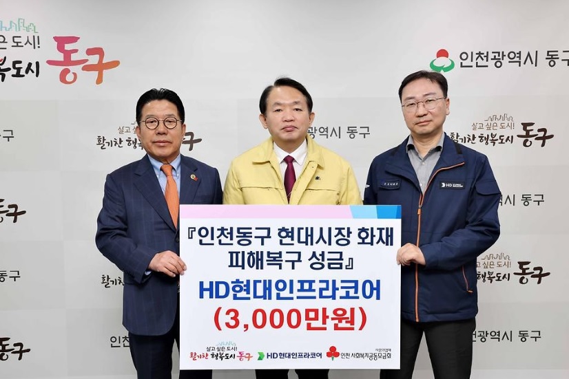 HD현대인프라코어(대표 조영철, 오승현)가 최근 화재로 큰 피해를 입은 인천 동구 현대시장과 상인들을 위해 3천만원을 기부했다고 31일(금) 밝혔다.
